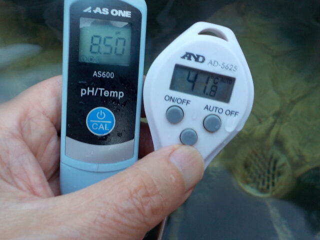 湯口:温度40.8℃、pH8.44、ORP値は61mvに収束した。