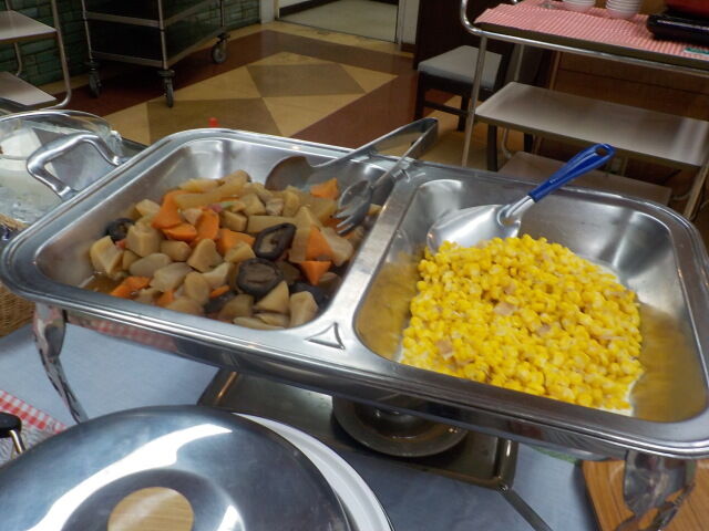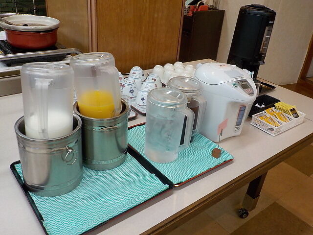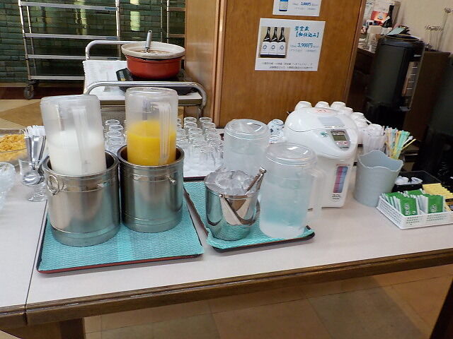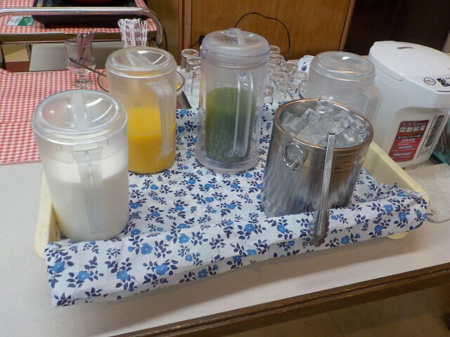 牛乳、ジュース、コーヒー、コーンフレーク、お汁粉、フルーツヨーグルト