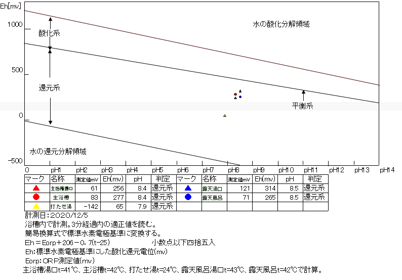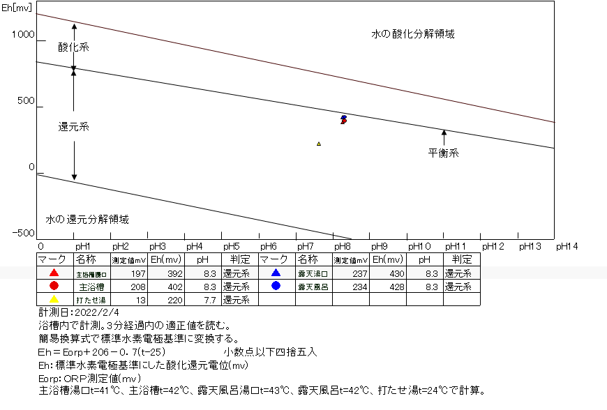 いずれも還元系にあり、温泉の鮮度は良好である。塩素系薬剤は極微量と思われる。