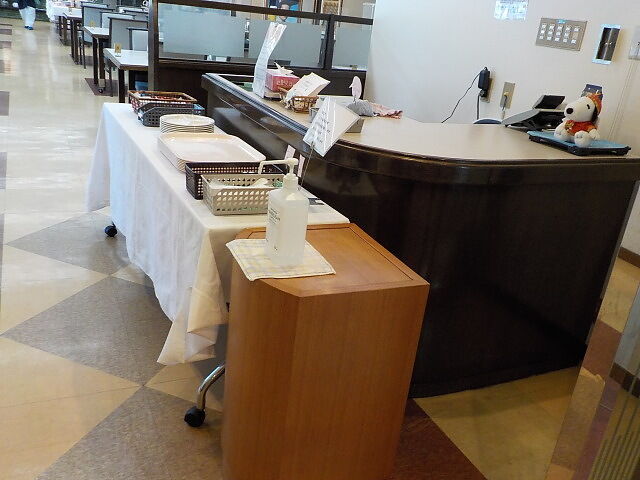 使い捨て手袋着用。ビュッフェ形式で席は自由。ドリンクコーナー