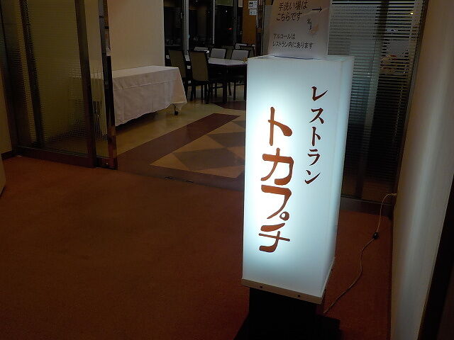 食事は1階レストラン「トカプチ」でとる。夕食時間:18時~20時30分(LO19時30分)、朝食時間:7時~9時(LO8時30分)。夕食時間は希望時間指定あり。