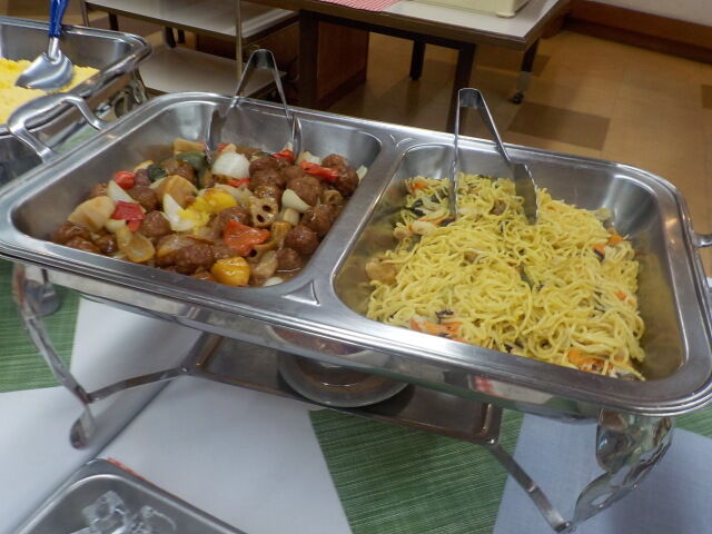 焼きそば、肉団子、焼売、筑前煮