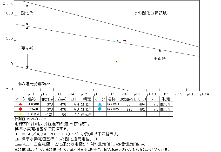 浴槽:温度41.3℃、pH8.34、ORP値は303mvに収束した。