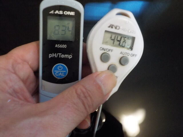 浴槽:44.0℃、pH8.34、ORP値は84mvに収束した。