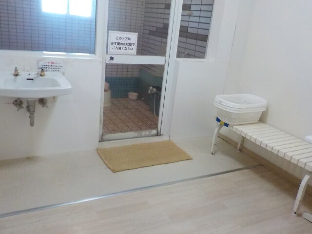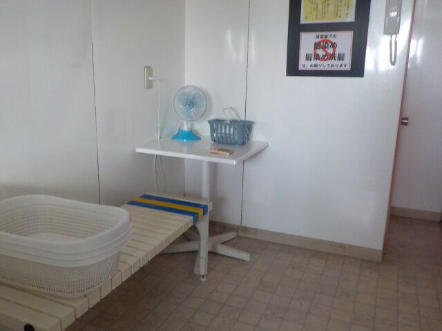 脱衣所にはベンチ、脱衣かご、洗面台、ミニ扇風機を設置。脱衣所に和式トイレあり。