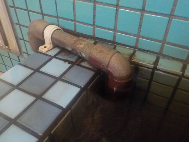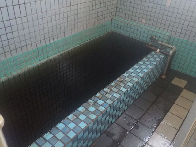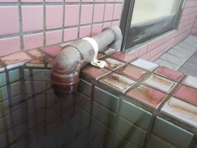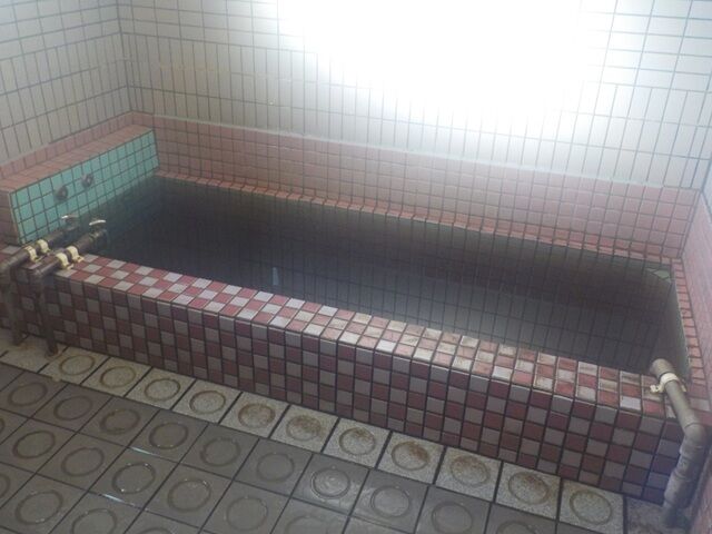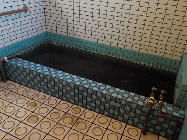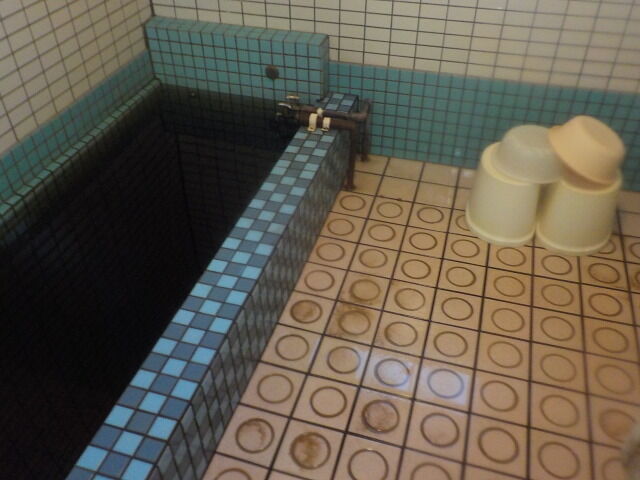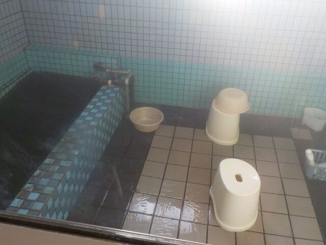 内径約70cm×約200cmの浴槽に、コーヒー色不透明の湯が満ちている。手前側が浅湯になっていて、他は約70cmの普通の深さ。湯口の他に湯蛇口(源泉)と加水蛇口が付いているが。エルボ管の湯口から約5ℓ/分注いでいる。知覚的には、微弱モール・微弱タマゴ臭、微弱重曹・微弱タマゴ味。溢れた湯は湯縁からオーバーフローしている。