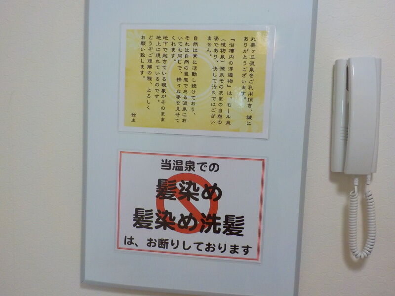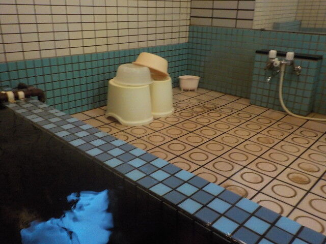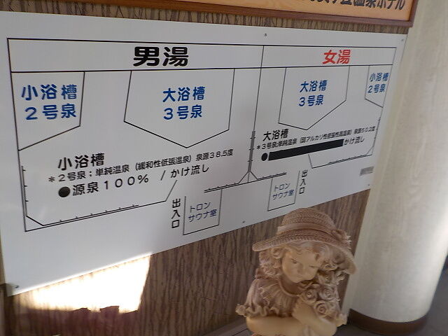 大浴場を利用する日帰り客は「ゆ」と描かれた玄関から出入りする。平成19(2007)年4月に大浴場をリニューアルしてシャワー付きカランに変更し、立ちシャワーの位置にトロンサウナを新設した。
