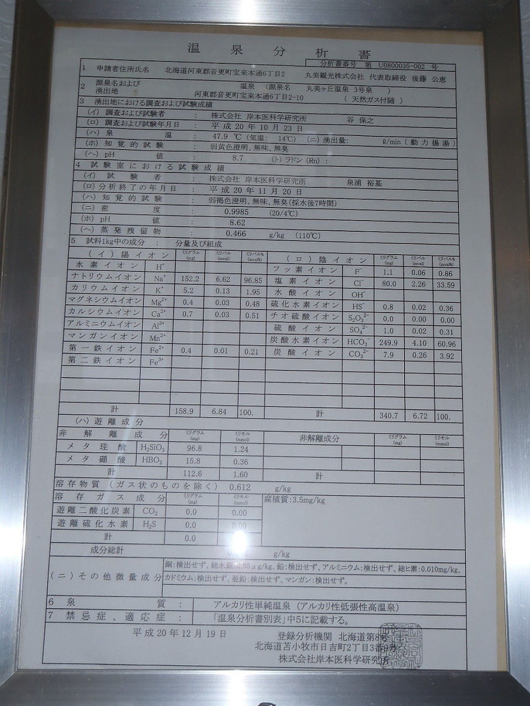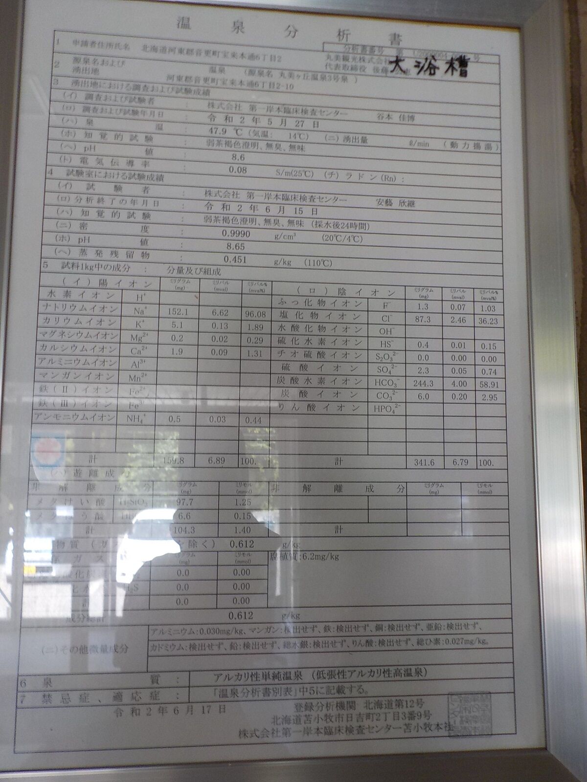 令和2年6月17日に作成した温泉分析書(第一岸本臨床検査センター)。泉温:47.9℃(気温:14℃)、湧出量: ℓ/分(動力揚湯)、pH値:8.6、溶存物質:0.612g/kg、成分総計:0.612g/kg、泉質:アルカリ性単純温泉(アルカリ性低張性高温泉)(旧泉質名:単純温泉) 、腐植質:6.2mg/kg