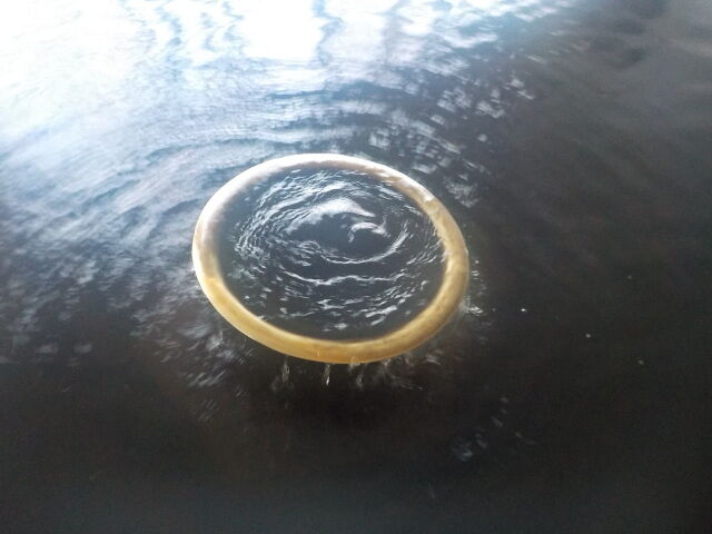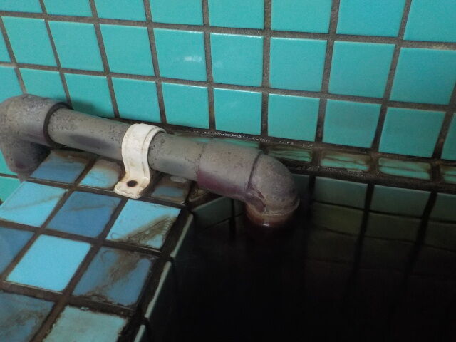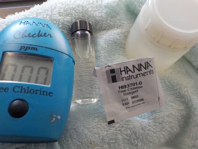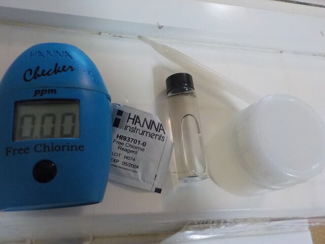 2023/12/4、15時頃、浴槽で試料をミニボトルで採取し、遊離残留塩素測定器で遊離残留塩素濃度を測定。