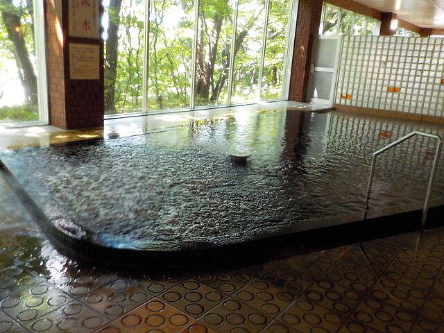 微黄褐色を帯びた透明の湯。晴れた日には、ガラス窓を通して映る木々の揺らめきで琥珀色のようにも見える。湯温が体温に近いので心臓に負担が掛からず長湯する客が多い。側壁の湯口孔から約20ℓ/分注湯。知覚的には、微弱モール・微弱炭酸・微弱タマゴ臭、微弱重曹味。溢れた湯は湯縁からオーバーフローしている。