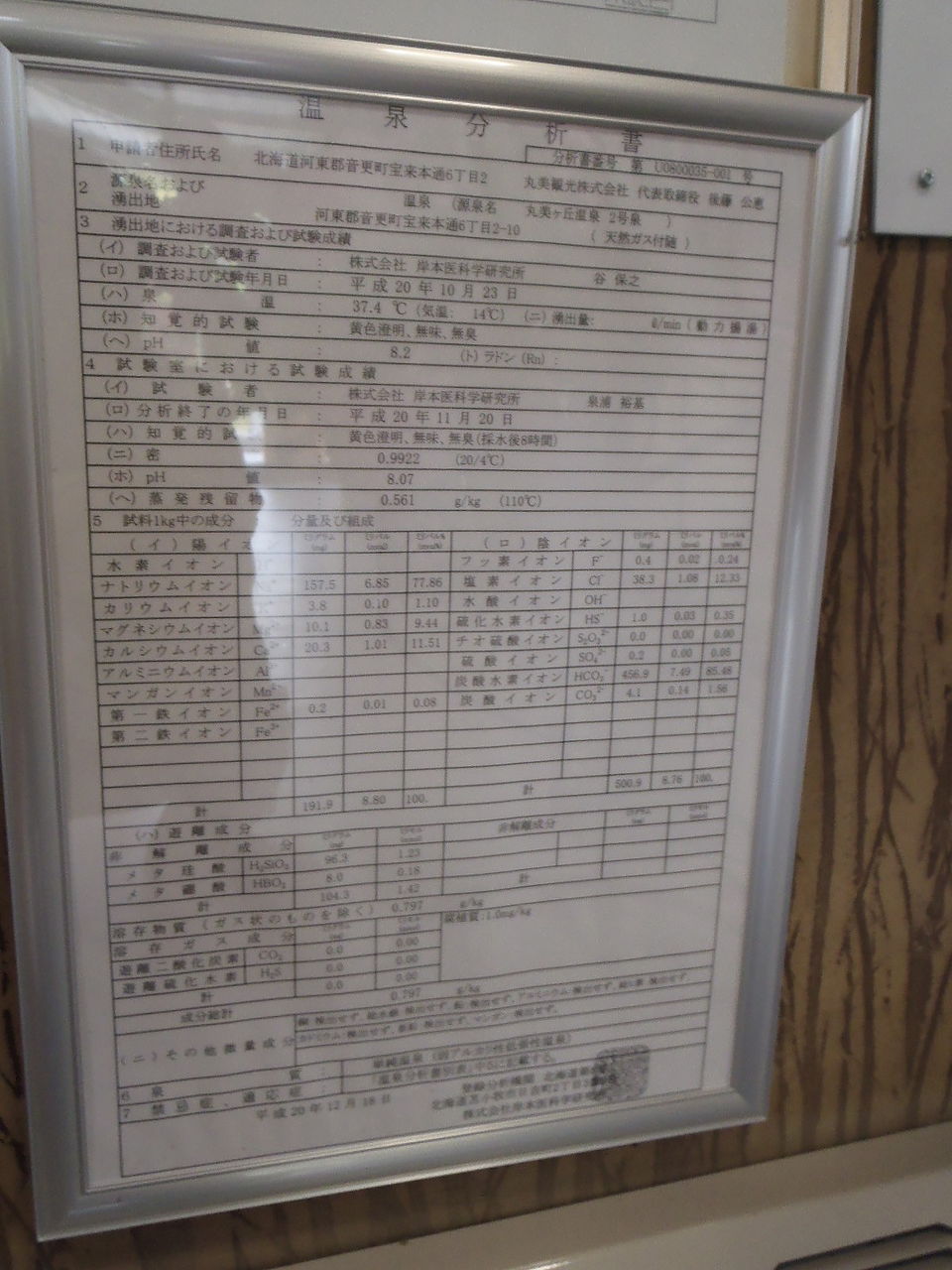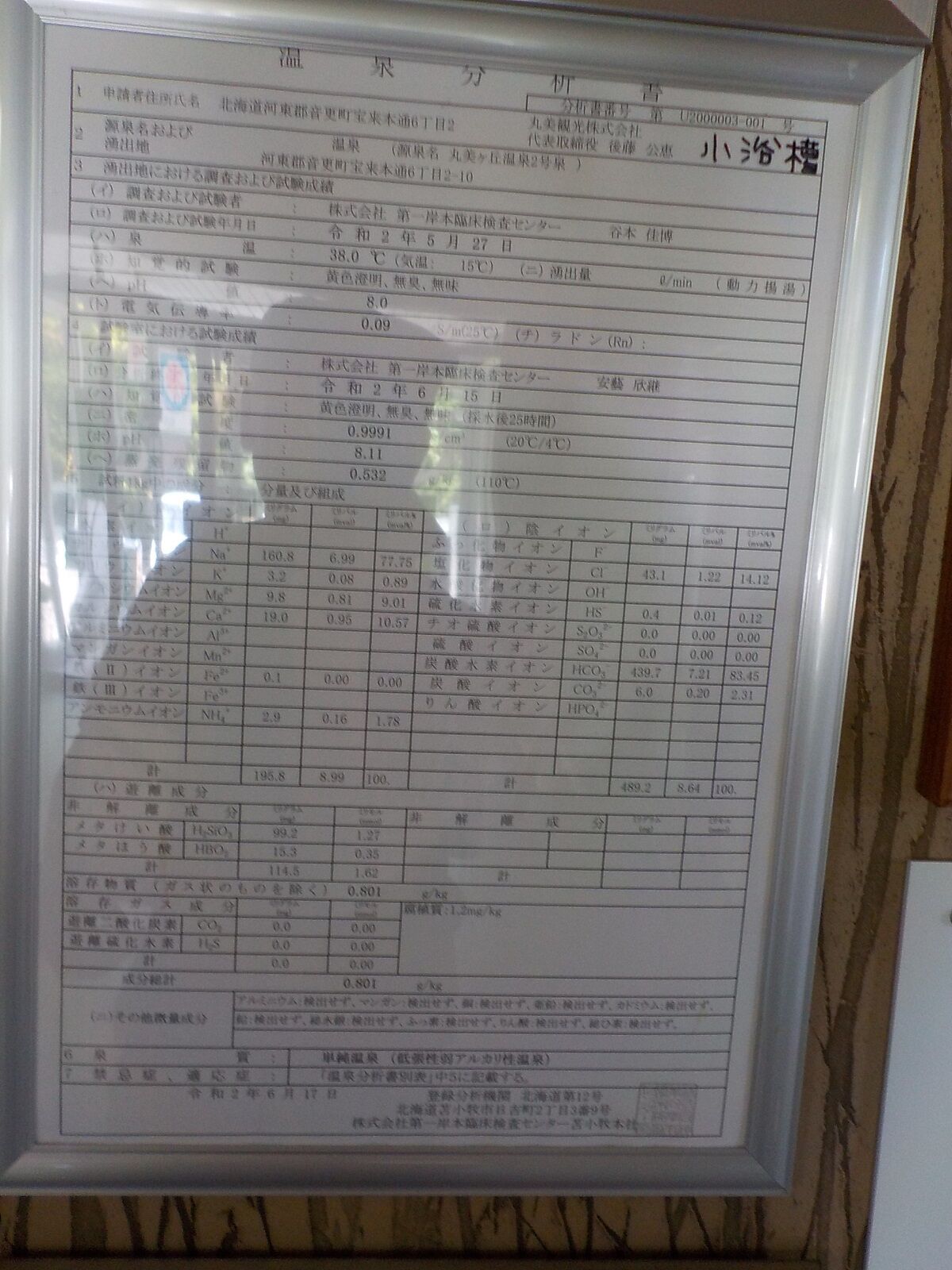 令和2年6月17日に作成した温泉分析書(第一岸本臨床検査センター)。泉温:38.0℃(気温:15℃)、湧出量: ℓ/分(動力揚湯)、pH値:8.0、溶存物質:0.801g/kg、成分総計:0.801g/kg、泉質:単純温泉(弱アルカリ性低張性温泉)(旧泉質名:単純温泉) 、腐植質:1.2mg/kg