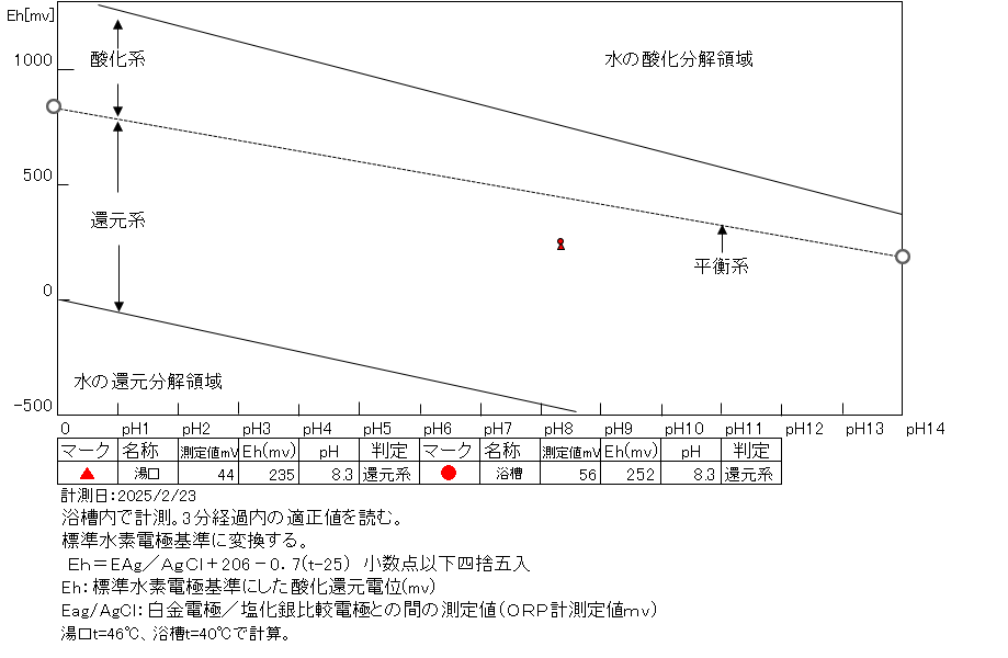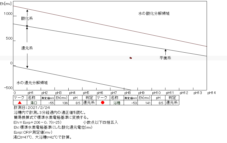 湯口:46.5℃、pH8.25、ORP値は55mvに収束した。
