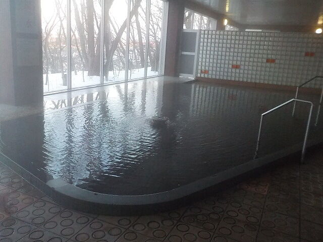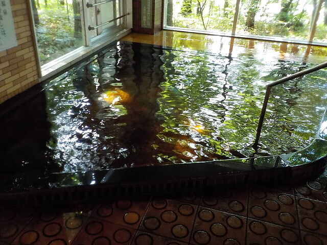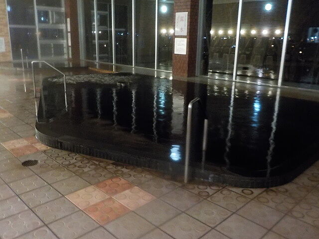 大浴槽はバイブラの浅湯と普通の浴槽からなる。注湯量は約30ℓ/分。知覚的には、微弱モール・微弱たまご臭、微弱重曹・微弱たまご味。黒湯に近いコーヒー色で透明度は約30cm。腐植質系の湯の華が浮遊している。溢れた湯は湯縁からオーバーフローしている。気温の高い期間のみ加水・かけ流し。モール系のぬるりとした浴感あり。
