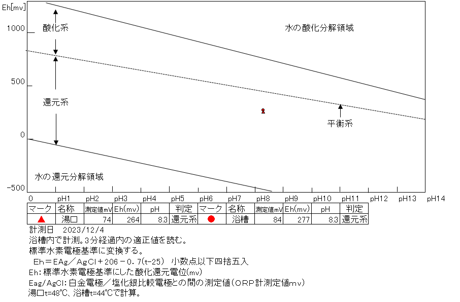 湯口:温度48.3℃、pH8.18、ORP値は-50mvに収束した。