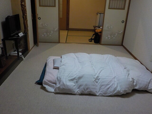 布団を広げるとすぐ横になれる。大浴場の利用はチェックイン~23時、6時30分~10時。