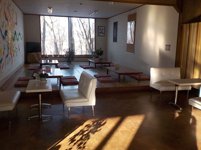 受付兼用の喫茶コーナー。休憩室もある。スピリチュアルアーテイスト・秋山峰男さんの「無償の愛」が壁に描かれている。