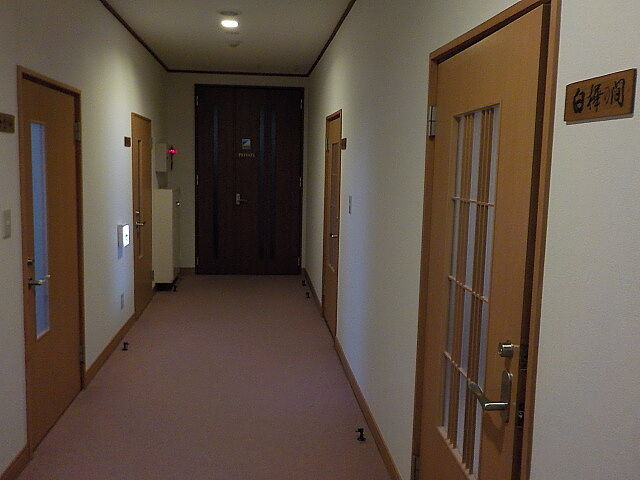 廊下の奥のドアが宿泊棟の出入り口になっている。宿泊者以外立ち入り禁止。