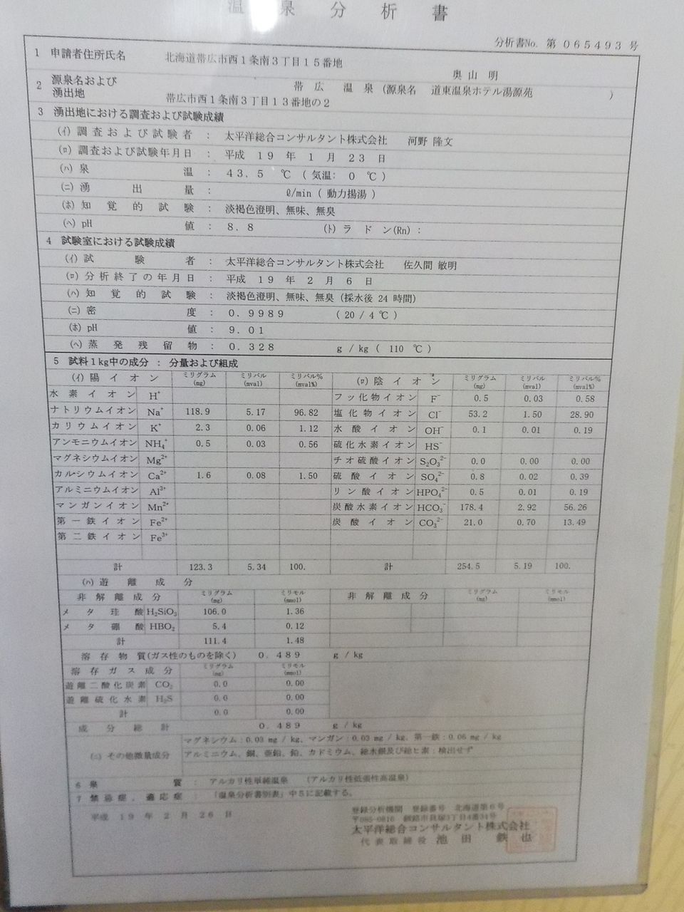平成19年2月26日に作成した温泉分析書(太平洋総合コンサルタント株式会社)。泉温:43.5℃(気温:0℃)、湧出量: ℓ/分(動力揚湯)、pH値:8.8、溶存物質:0.489g/kg、成分総計:0.489g/kg、泉質:アルカリ性単純温泉(アルカリ性低張性高温泉)(旧泉質名:単純温泉)