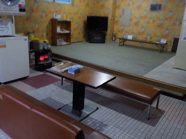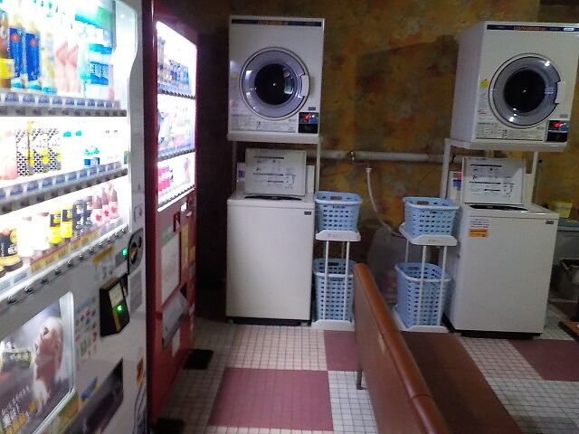 大浴場の付近に時代を感じさせる休み処。洗濯機と乾燥機がある。