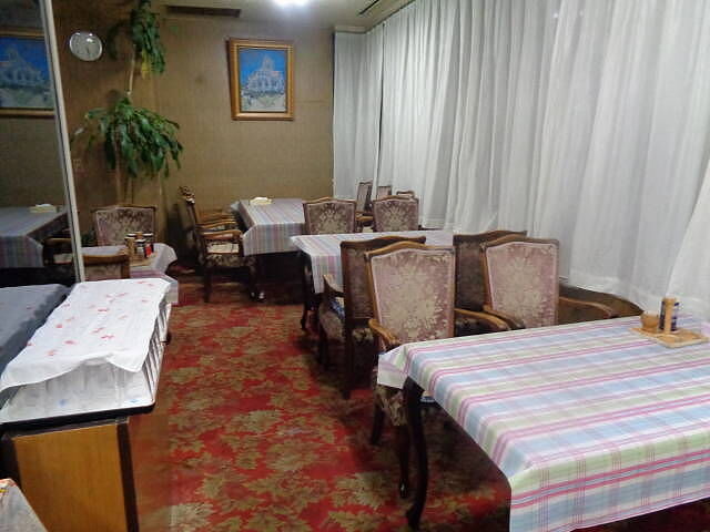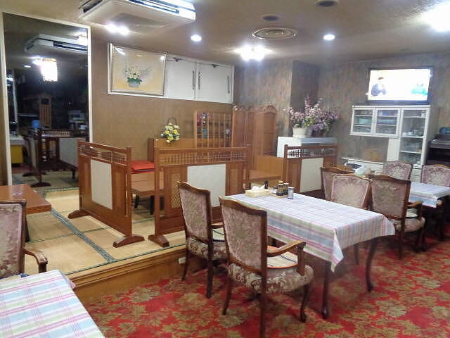 昭和レトロな店内。朝食は7時~8時30分、夕食は17時~20時30分。社長が一人で調理とホールを担当している。都合で提供できない場合も有る。