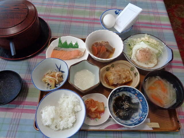 朝食付きプランの日替わり和定食。塩鮭、卵焼き、とろろ、ナスの煮浸し、揚げ出し豆腐、煮物、和え物、納豆、生卵、ご飯、味噌汁、漬物。お櫃のご飯は全部食べきれない。