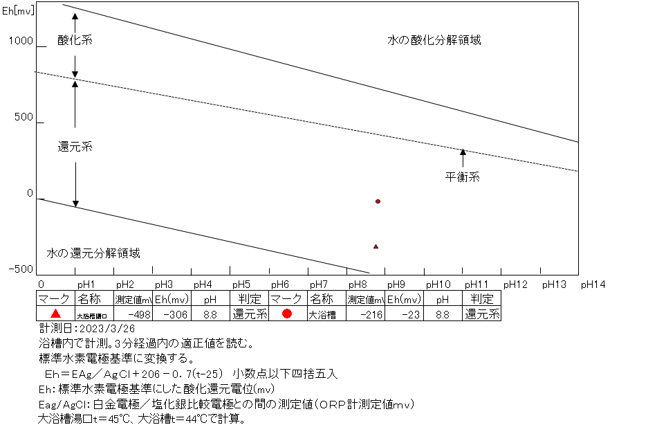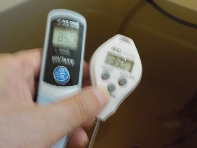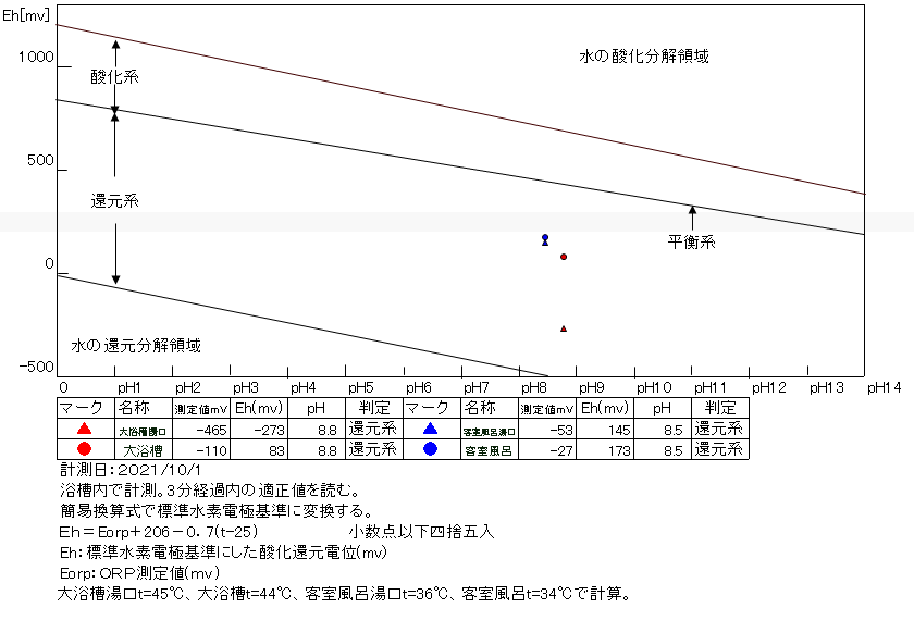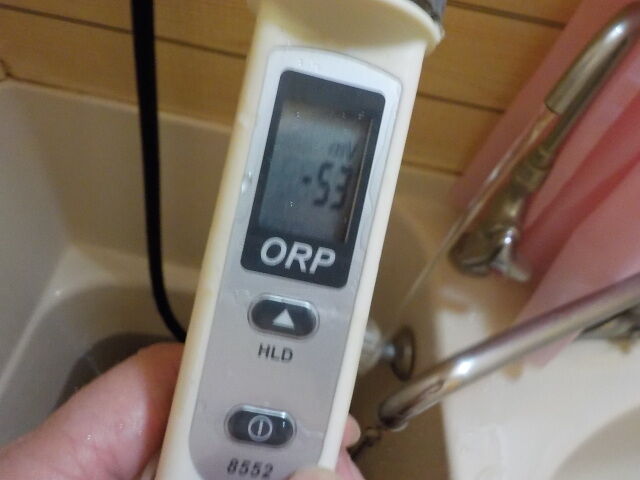 浴槽:温度43.4℃、pH8.74、ORP値は-142mvに収束した。