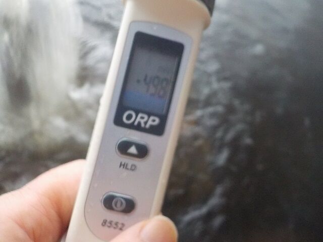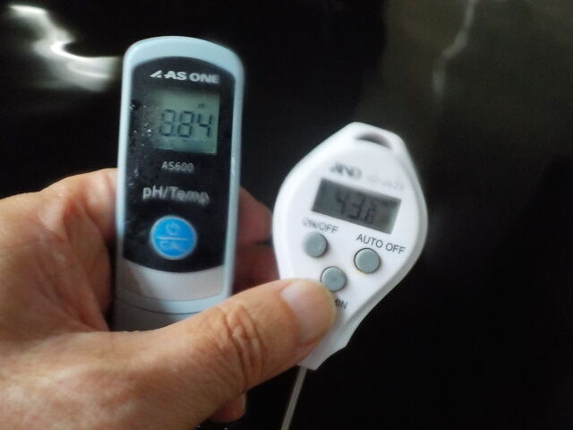 浴槽:温度43.8℃、pH8.80、ORP値は-216mvに収束した。