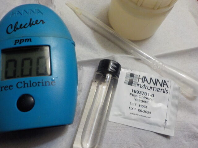 2024/12/25、22時10分頃、大浴槽で試料をミニボトルで採取し、遊離残留塩素測定器で遊離残留塩素濃度を測定。