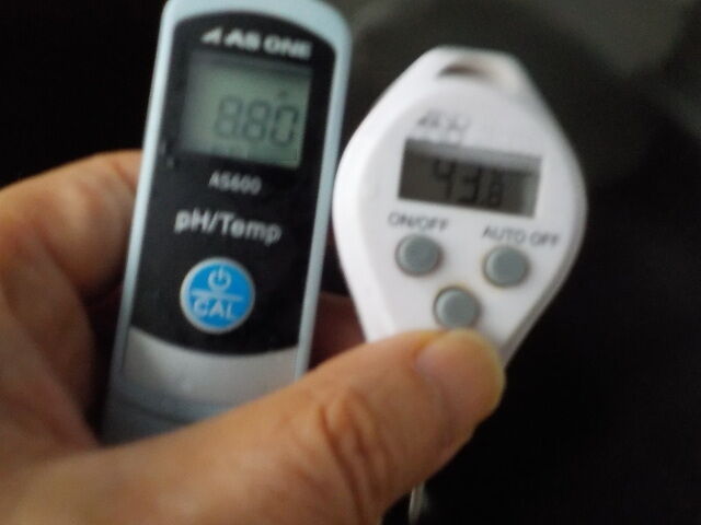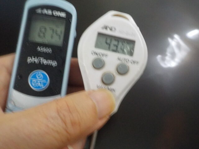 浴槽:温度43.8℃、pH8.84、ORP値は-110mvに収束した。