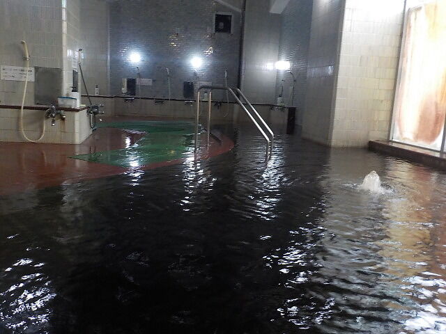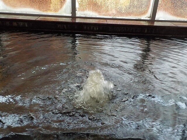 雲形の大浴槽は浅湯と深湯に分かれている。浅湯側には、バイブラ設備があるものの長いあいだ稼動していない。
