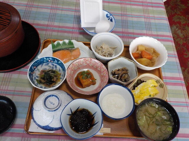 朝食付きプランの日替わり和定食。塩鮭、卵焼き、とろろ、肉じゃが、ほうれん草のお浸し、モズク酢、あんかけ豆腐、ごぼうサラダ、煮物、納豆、生卵、ご飯、味噌汁、漬物。お櫃のご飯は全部食べきれない。