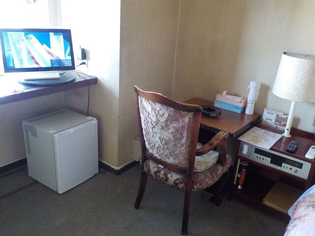 宿泊部屋は3階のシングルルーム。エアコン付き。ポットは受付で借りる。