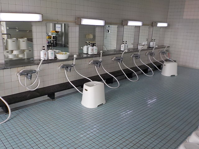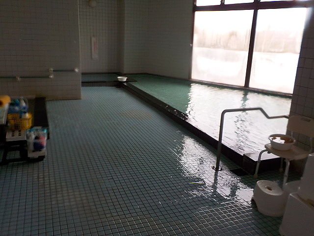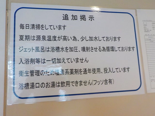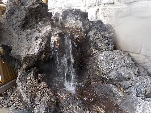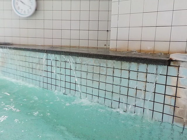 ほとんど無色透明の湯。湯口台から約40ℓ/分落水している。知覚的には、塩素系薬剤臭味。溢れた湯は湯縁からオーバーフローしている。