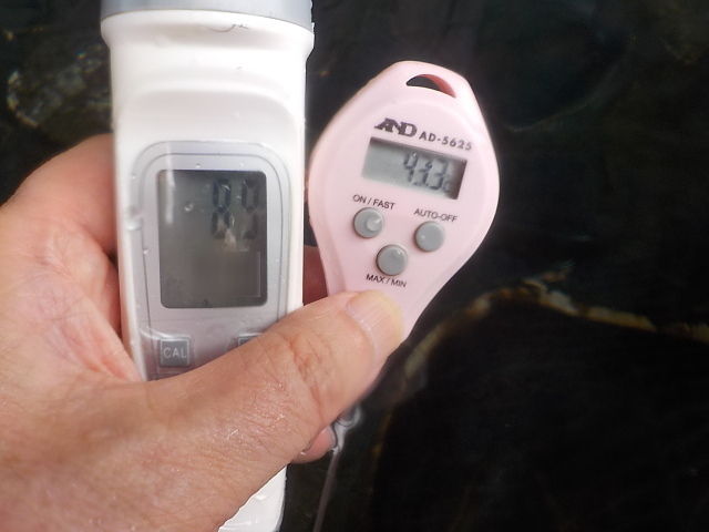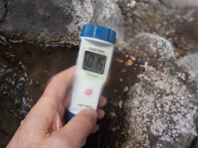 湯口:温度44.7℃、pH8.9、ORP値は338mvに収束した。