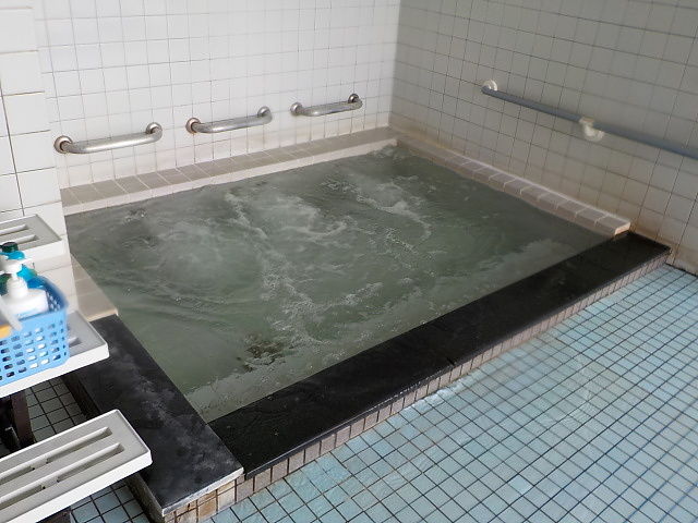 ほとんど無色透明の湯。ジェット噴流が3人分。側壁湯口から微量注湯。底面にジェット噴流用の吸込口がある。溢れた湯は湯縁からオーバーフローしている。