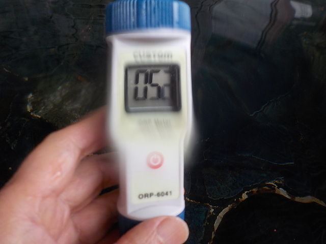 2018/5/6、10時10分~30分、浴槽内でORP計測。源泉かけ流し&ジェット噴流構造的循環で、塩素系薬剤使用。