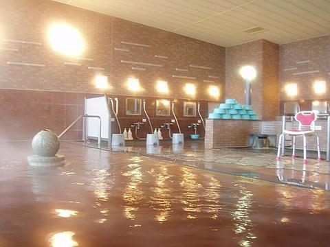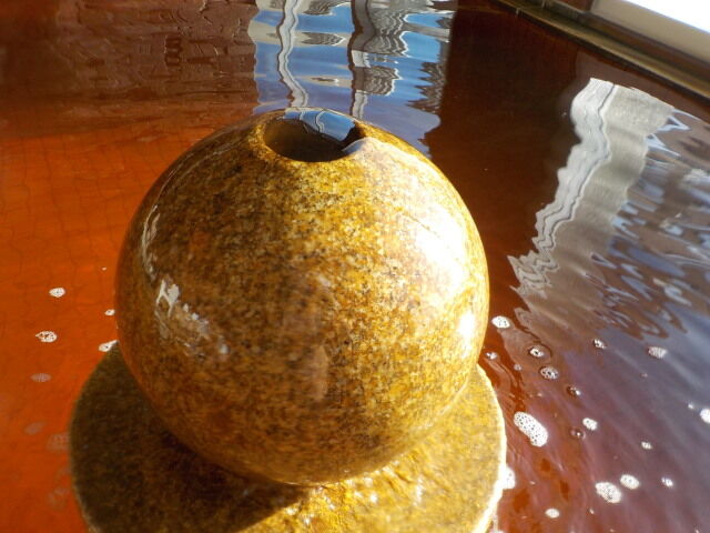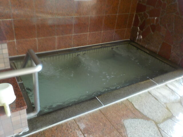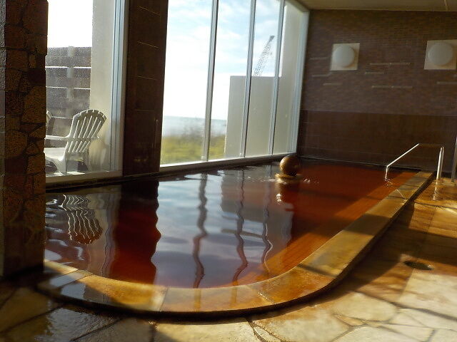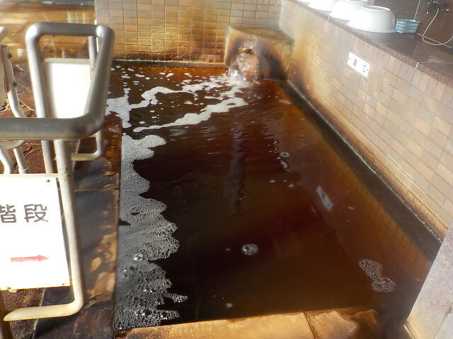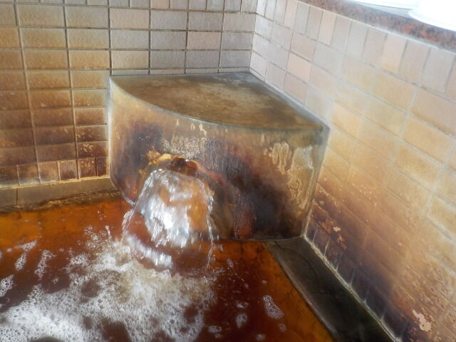 赤褐色半透明の湯。球石の湯口から循環湯が注ぎ、パイプ状の循環戻り管から湯が吸い込まれている。知覚的には、ヨード臭&アンモニア臭、強カン味。窓側側壁の湯孔から浴槽内の湯が吐出しているが、湯底の吸込口と対になってる。浴槽内をかき混ぜているようだ。溢れた湯の一部は湯縁からオーバーフローしている。高い数値の炭酸水素イオンを含有しているせいか、意外にもつるすべした肌触りである。間欠的に塩素系薬剤を注入しているが、注入時はORP値は高くなり、休止時は低くなる。ヨードをアピールするのであれば、敢えて塩素系薬剤を注入する必要もないと思う。ちなみに、ヨードはレジオネラ属菌にも効果があ.るという。