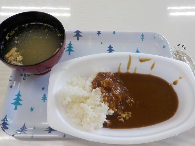 カレーもある。味噌汁はインスタント。玉子は温泉卵。