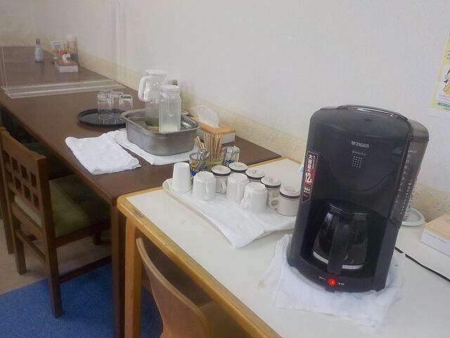 長テーブルに朝食膳が用意されている。ご飯、味噌汁、カレー、ドリンクはセルフサービス。