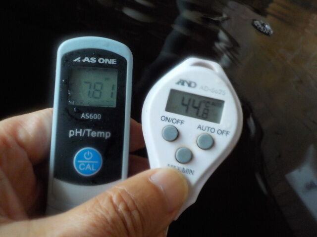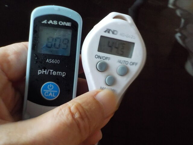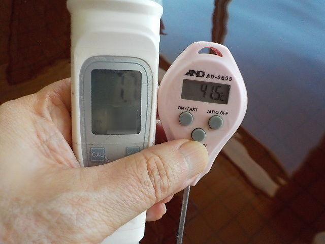 浴槽:温度44.5℃、pH8.09、ORP値は160mvに収束した。