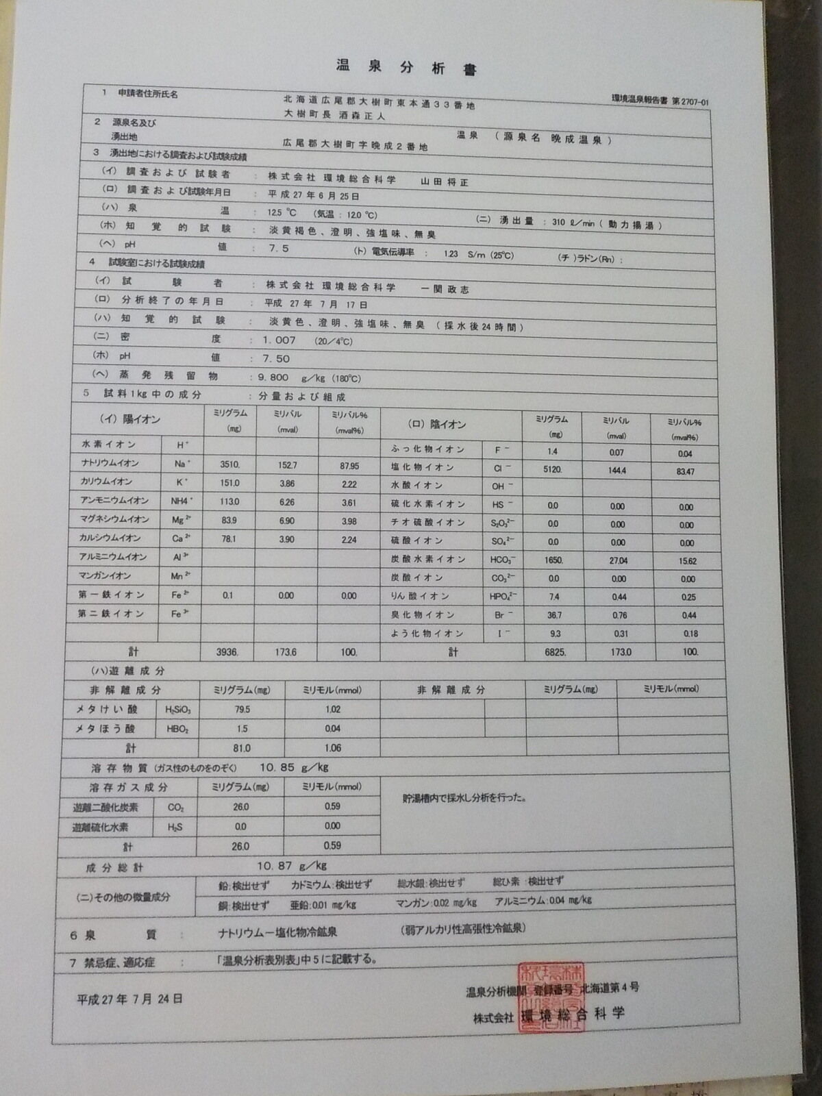 平成27年7月24日に作成した温泉分析書(環境総合科学)。泉温:12.5℃(気温12℃)、湧出量:310ℓ/分(動力揚湯)、pH値:7.5、溶存物質:10.85g/kg、成分総計:10.87g/kg、泉質:ナトリウム-塩化物冷鉱泉(高張性弱アルカリ性冷鉱泉)旧温泉分析書は脱衣所に掲示している。1975年に掘削した1号井は、深度700.5m、泉温14℃、湧出量17ℓ/分しかなかった。1995年掘削した現在の2号井(地質研コード259-004)は、1995年10月の調査で深度700m、泉温20.9℃、湧出量133ℓ/分。