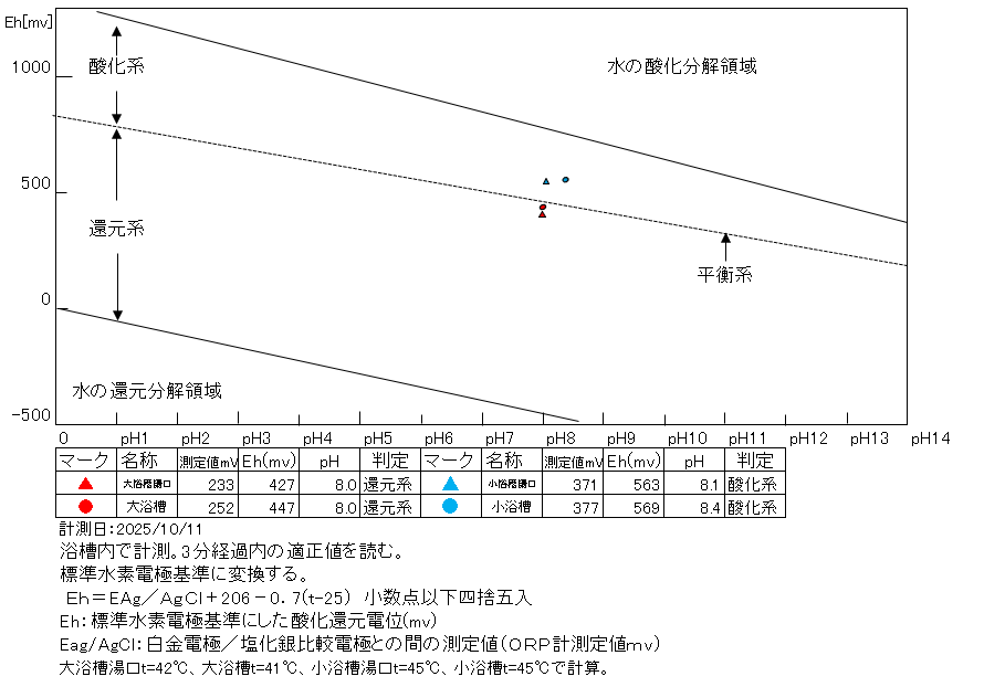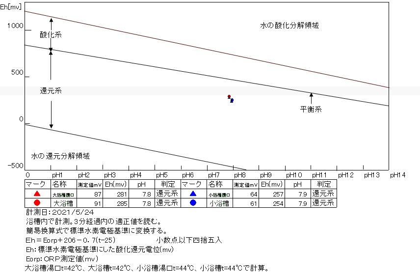 早朝の大浴槽の湯口は酸化系にあるが、浴槽内は還元系に収まっている。早朝の小浴槽もかろうじて還元系に収まっている。時間が経って遊離残留塩素濃度が高くなると浴槽内のEhも跳ね上がると思われる。