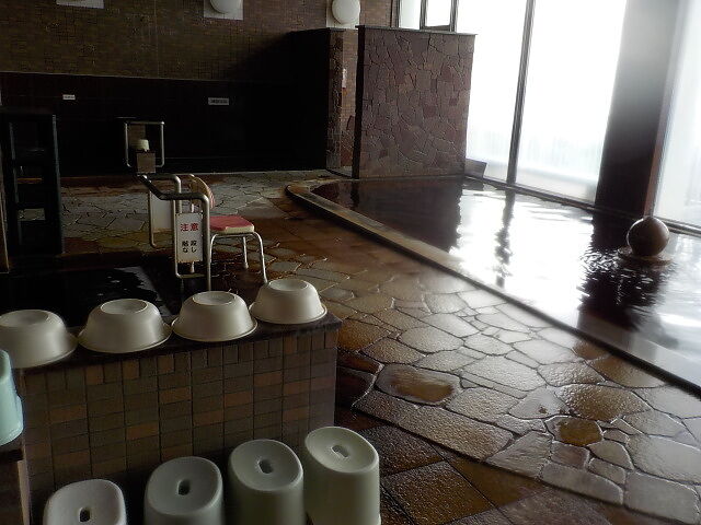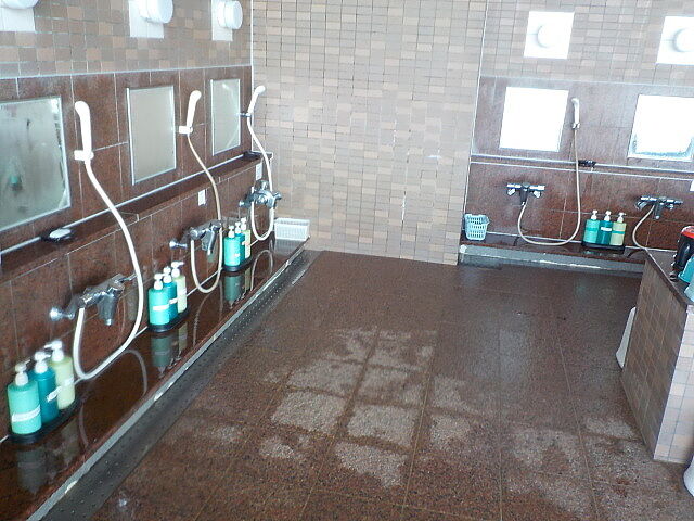 浴室に入ると、アンモニア・ヨード・塩素系薬剤が複雑に混ざりあった刺激臭が漂う。大浴槽、小浴槽、水風呂、ジェットバス(沸かし湯)、サウナを配置。シャワー付カラン10台、シャンプー・コンディショナー・ボディソープあり。
