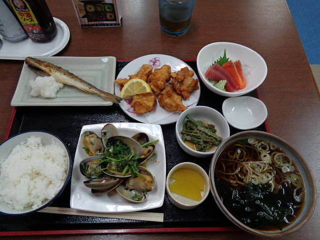 焼き魚(こまい)、アサリの酒蒸し、鶏の唐揚げ、刺身、温そば、煮物、ご飯、漬物。ご飯のお代わり自由。