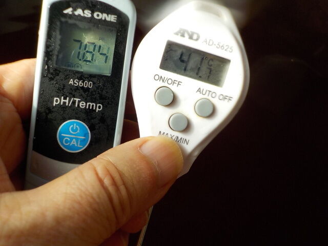 浴槽:温度41.5℃、pH7.7、ORP値は437mvに収束した。