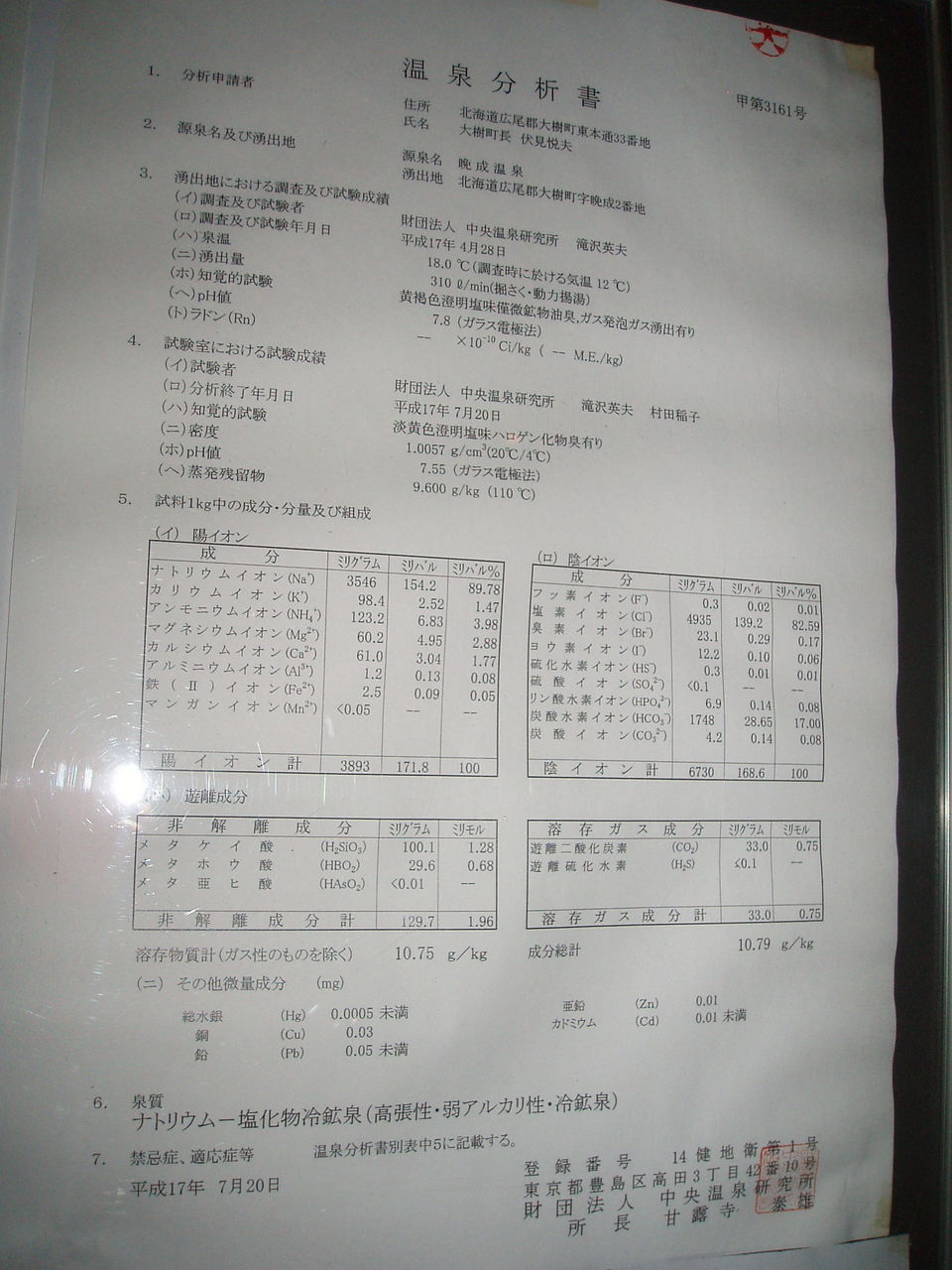 平成26(2014)年7月に「鉱泉分析法指針」が改定され、温泉水1kg中によう化物イオンが10mg以上含有すれば含ヨウ素泉と認定されたが、最近の温泉分析ではヨウ化物イオンが10mb/kg未満なので含ヨウ素泉とはなっていない。