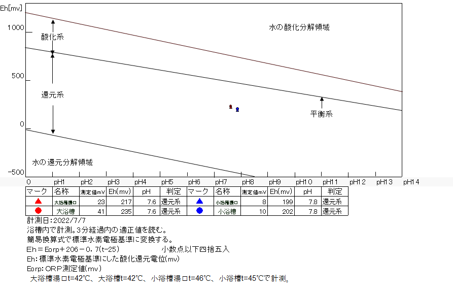 湯口:温度40℃~43℃、pH7.62、ORP値は23mvに収束した。