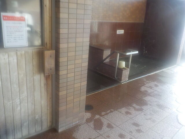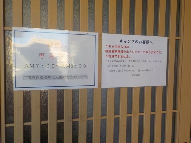 朝食、朝風呂は温泉棟の右側玄関から出入りする。キャンプ利用者は利用不可(表玄関から)。