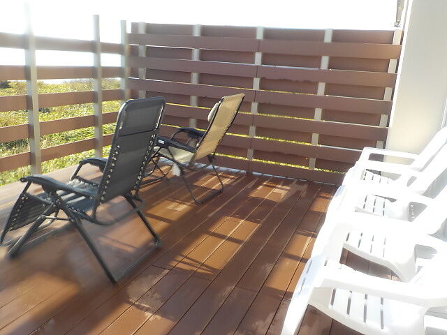 バルコニーを拡張し、リラックスできるチェアを設置した。露天風呂はないが、バルコニーから太平洋の海原を眺めることが出来る。