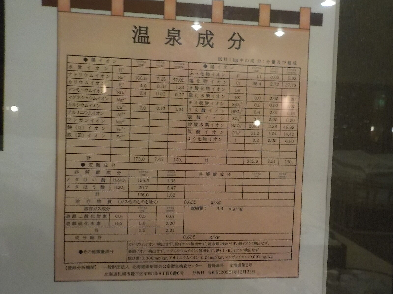 温泉分析書をボードにプリントしているが、何カ所か欠落して不明な個所もある。 令和5年12月21日に分析した温泉分析書(北海道薬剤師会公衆衛生検査センター)。泉温:℃(気温:-℃)、湧出量:ℓ/分、pH値:、溶存物質:0.635g/kg、成分総計:0.635g/kg、泉質:アルカリ性単純温泉(アルカリ性低張性高温泉)(旧泉質名:単純泉)、腐植質:3.4mg/kg